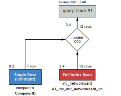 The execution plan for the same query after installing Database Index Packs. The lookup on the inv_networkcard table has improved from a full table scan to a full index scan.