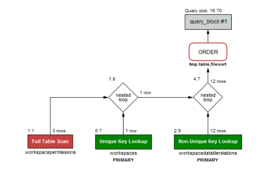 The original query performed a full table scan on the workspacepermissions table (the worst case scenario for performance at scale). In this particular example the file sort is unavoidable due to the query structure, but with the addition of the index (and a 66% reduction in rows returned from the first table) it’s increasingly likely that the data set is smaller and that the temporary table will be able to fit into memory and not be written to disk. It’s also worth noting that this particular table ships with a composite index, but it’s columns are in the wrong order for this query.
