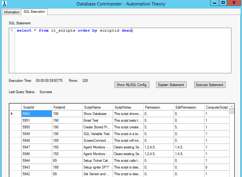 The lt_scripts table. This screenshot shows it sorted showing the newest scripts first (highest scriptid). We can see that several scripts don’t have EditPermission values.